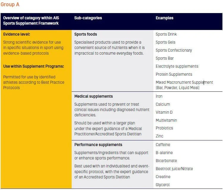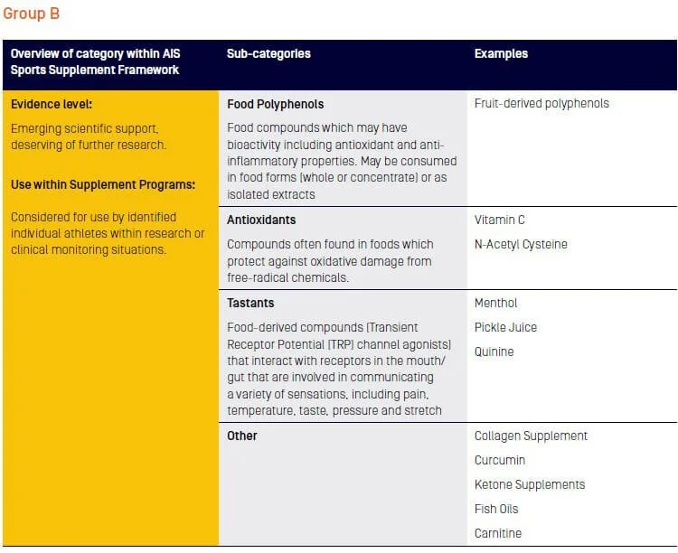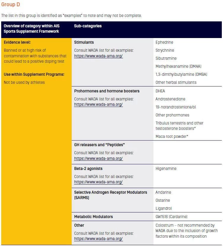Da segnalare che l’HMB (beta-idrossi beta-metilbutirrato) è stato declassificato nel gruppo C nella più recente revisione dell’AIS.